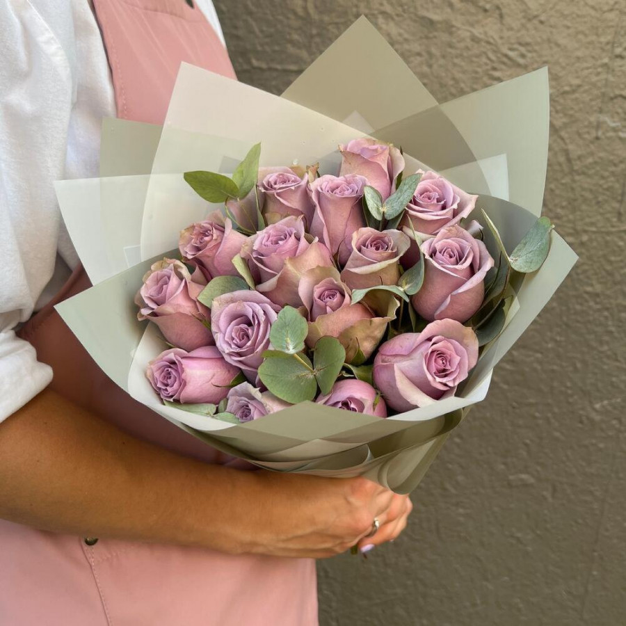 На фото букет из 15 фиолетовых роз. В составе: роза 15 шт, дизайнерская упаковка 1 шт, атласная лента 1 шт, . Все цветы свежие и ароматные, букет красиво оформлен и отлично подходит для подарка. Доступна доставка цветов или самовывоз.