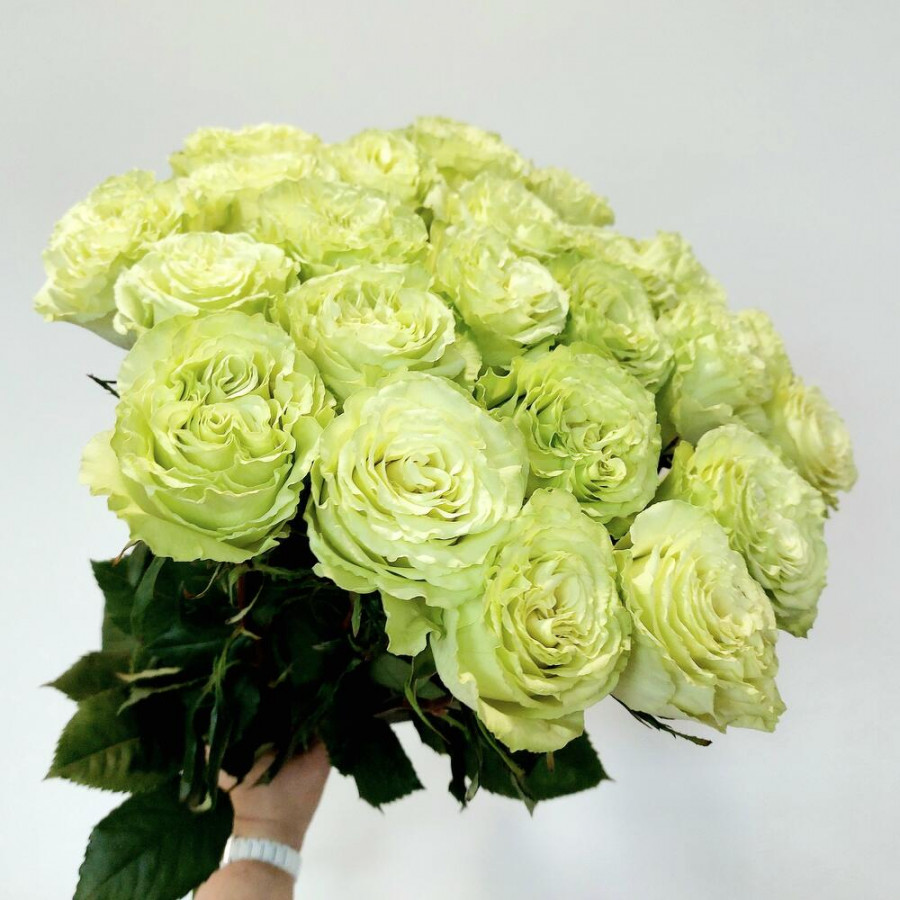 На фото букет из 21 зеленой розы. В составе: пионовидная роза 21 шт, атласная лента 1 шт, . Все цветы свежие и ароматные, букет красиво оформлен и отлично подходит для подарка. Доступна доставка цветов или самовывоз.