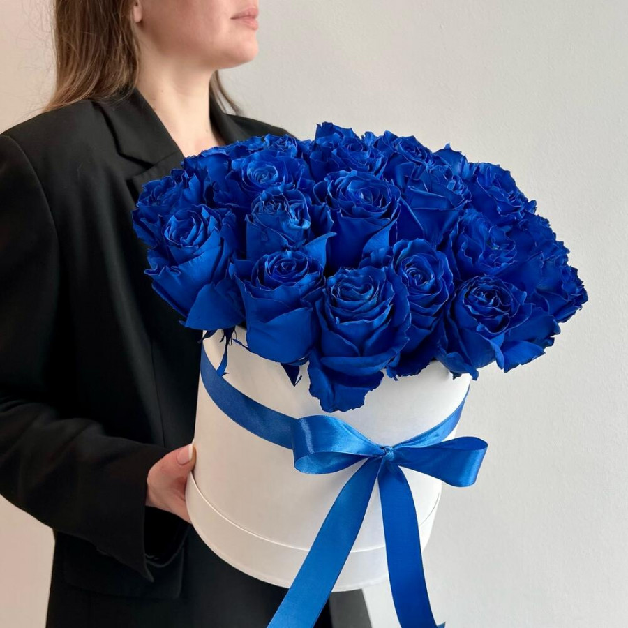 На фото 25 синих роз в коробке. В составе: роза (синяя) 25 шт, оазис флористический 2 шт, коробка (m) 1 шт, атласная лента 1 шт, . Все цветы свежие и ароматные, букет красиво оформлен и отлично подходит для подарка. Доступна доставка цветов или самовывоз.