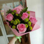 На фото букет из 5 роз и хризантем. В составе: роза 5 шт, хризантема кустовая 4 шт, папоротник 2 шт, крафт-бумага 1 шт, атласная лента 1 шт, . Все цветы свежие и ароматные, букет красиво оформлен и отлично подходит для подарка. Доступна доставка цветов или самовывоз.