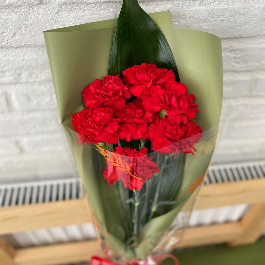 На фото букет из 7 красных гвоздик. В составе: гвоздика 7 шт, крафт-бумага 1 шт, атласная лента 1 шт, . Все цветы свежие и ароматные, букет красиво оформлен и отлично подходит для подарка. Доступна доставка цветов или самовывоз.