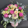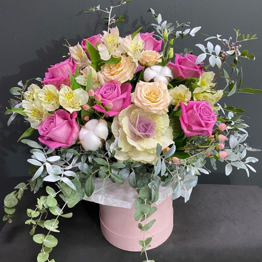 На фото букет из экзотических цветов в коробке. В составе: капуста декоративная 1 шт, роза 7 шт, кустовая роза 1 шт, альстромерия 3 шт, хлопок 3 шт, эустома (лизиантус) 1 шт, гиперикум 3 шт, эвкалипт 3 шт, шляпная коробка (s) 1 шт, . Все цветы свежие и ароматные, букет красиво оформлен и отлично подходит для подарка. Доступна доставка цветов или самовывоз.