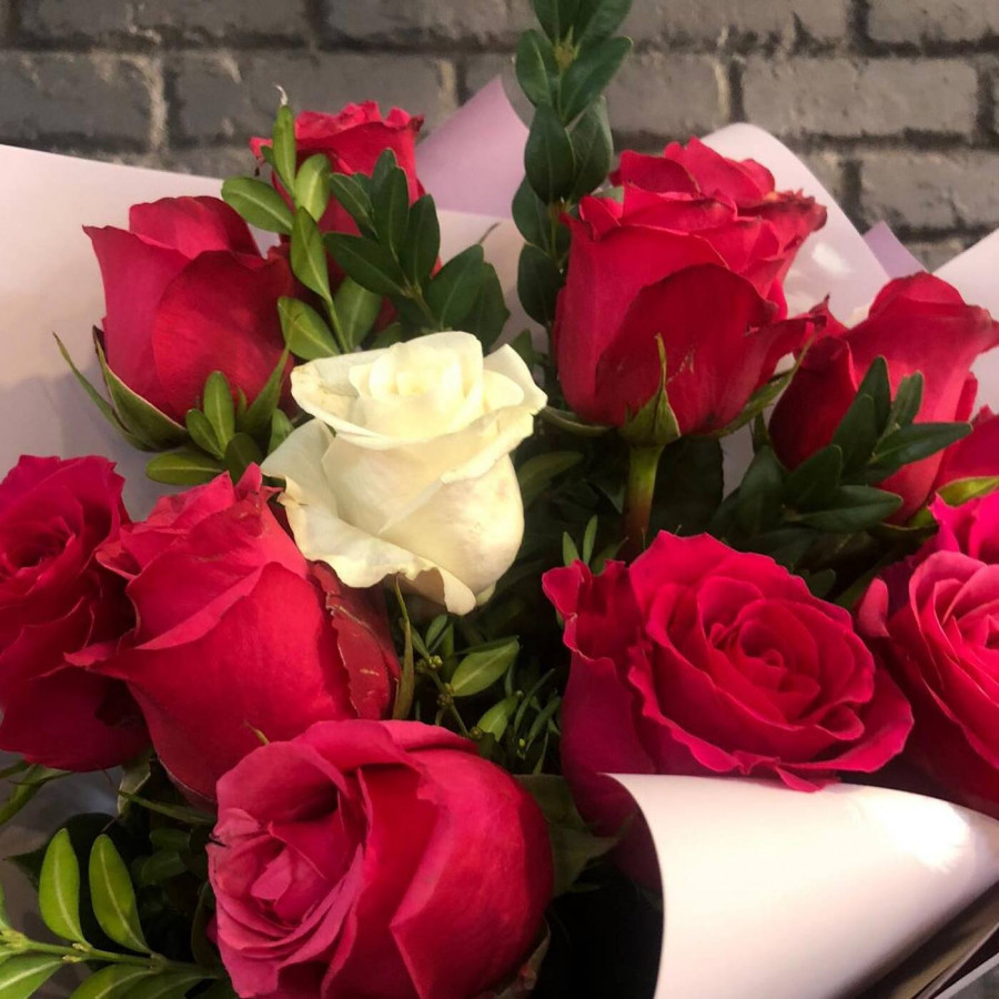 На фото букет из красных роз с зеленью. В составе: роза 13 шт, писташ 2 шт, крафт-бумага 1 шт, атласная лента 1 шт, . Все цветы свежие и ароматные, букет красиво оформлен и отлично подходит для подарка. Доступна доставка цветов или самовывоз.