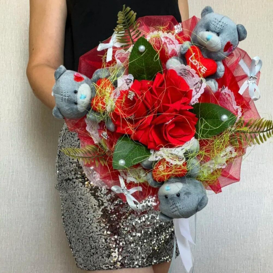 На фото букет из мягких игрушек 3 мишек тедди. В составе: . Все цветы свежие и ароматные, букет красиво оформлен и отлично подходит для подарка. Доступна доставка цветов или самовывоз.