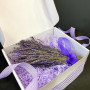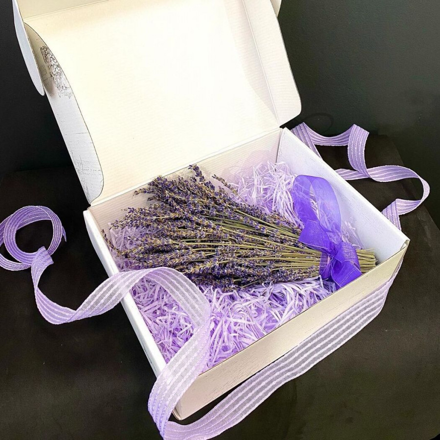 На фото коробка лаванды. В составе: лаванда 5 шт, коробка (s) 1 шт, атласная лента 1 шт, . Все цветы свежие и ароматные, букет красиво оформлен и отлично подходит для подарка. Доступна доставка цветов или самовывоз.